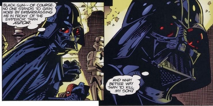 Sombras del Imperio estaba en una posición única cuando se trataba de Darth Vader, ya que no podía enfrentarse a los héroes principales, pero era demasiado popular para dejarlo de lado por completo. Habría sido difícil hacer que se comportara como un villano heterosexual, ya que su redención al final de El regreso del Jedi estaba llegando. La solución fue enfrentarlo a un rival: el Príncipe Xizor, jefe de la organización criminal Sol Negro. Debido a que Xizor no era particularmente agradable y estaba tratando de tomar el lugar de Vader a los ojos del Emperador, permitió a los lectores apoyar a Vader. Príncipe Xizor impulsa gran parte de la trama de Oscuridad, y es el raro enemigo común tanto para Vader como para sus hijos. También era un personaje difícil de conectar, ya que trata de matar Lucas y seducir leer. El hecho de que no haya reaparecido en el nuevo Guerra de las Galaxias Canon señala el hecho de que era un criminal en su mayoría olvidable que no era mucho más que un obstáculo para ocupar el tiempo de Vader.
