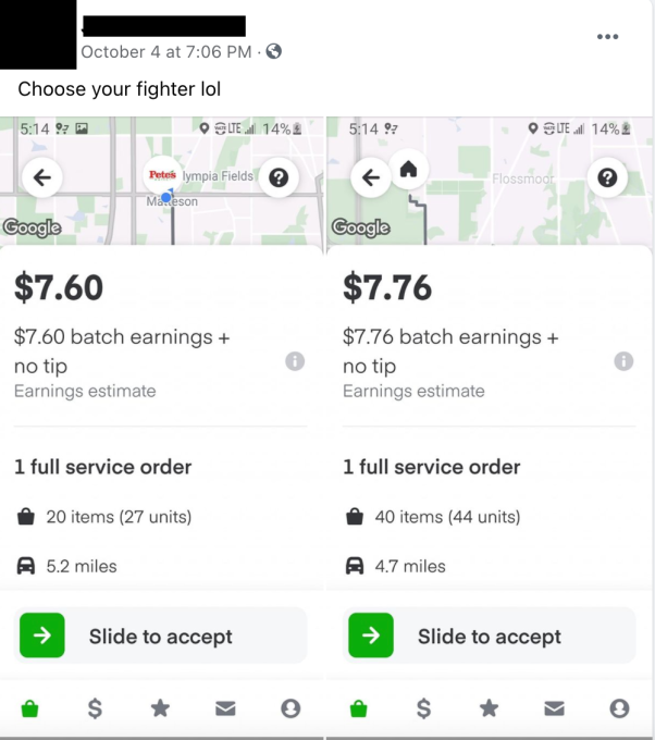 En el pasado, los compradores establecían las horas que querían trabajar y, durante ese tiempo, se les asignaban lotes individualmente: tenían cuatro minutos para revisarlo y decidir si querían aceptarlo antes de que se lo asignara a otra persona. Desde 2019, Instacart ha utilizado un sistema a pedido, donde los compradores pueden elegir trabajar en cualquier momento. Debido a eso, a muchos compradores se les ofrecerá un lote a la vez, que muestra el salario base, la propina, la distancia para conducir y una vista previa de los artículos en el pedido: quien pase por el lote primero obtiene el trabajo. Goen le dijo a TechCrunch que su área está tan saturada de compradores que cuando aparece un lote, debe aceptarlo sin tomarse mucho tiempo para revisar los detalles.