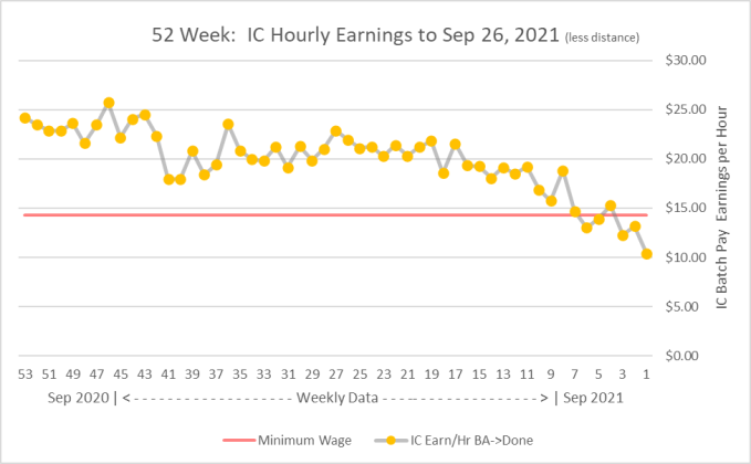 The Gig Workers Collective le dijo a TechCrunch que los trabajadores han visto una reducción significativa en sus ganancias durante los últimos tres meses. Un comprador en Canadá, Daniel Feuer escribió recientemente una carta abierta al CEO de Instacart, Fidji Simo, quien tomó el mando de la compañía en julio. Creó un gráfico que muestra su salario por hora durante el último año.