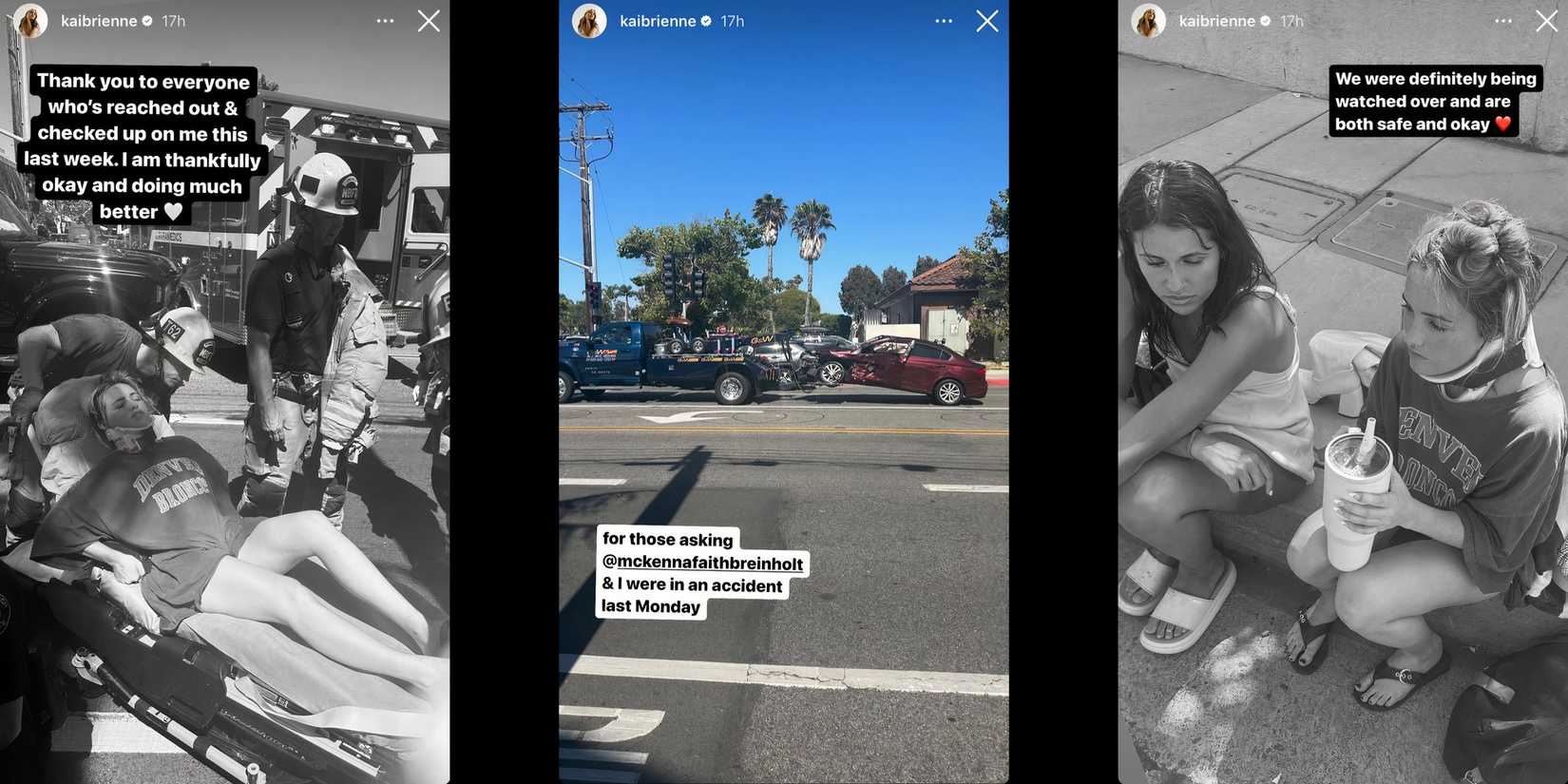 En la primera fotografía, Kaibrienne yace en una camilla con un collarín. Escribió: “Gracias a todos los que se comunicaron conmigo y me preguntaron cómo estaba la semana pasada. Afortunadamente estoy bien y mucho mejor.“ Luego se ve el coche destrozado del lado del conductor. En la última foto, Kaibrienne escribió: “Definitivamente estábamos siendo vigilados y ambos estamos a salvo y bien”. McKenna También compartió la segunda fotografía en una historia de Instagram.