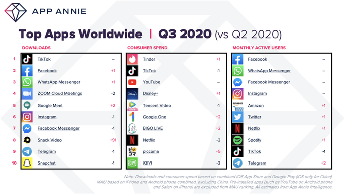 Sin embargo, en términos de usuarios activos mensuales, Facebook aún dominaba las listas de éxitos, ocupando las posiciones No. 1 a No. 4 para Facebook, WhatsApp, Messenger e Instagram, respectivamente. Las siguientes aplicaciones más utilizadas fueron Amazon, Twitter, Netflix, Spotify, TikTok y luego Telegram. Este último entró en el top 10 por primera vez, después de saltar dos rangos desde la Q2.