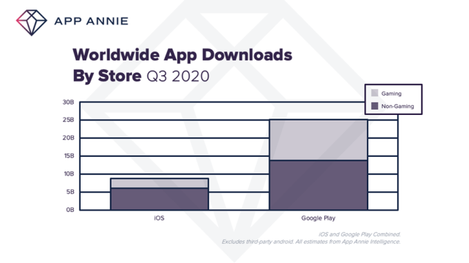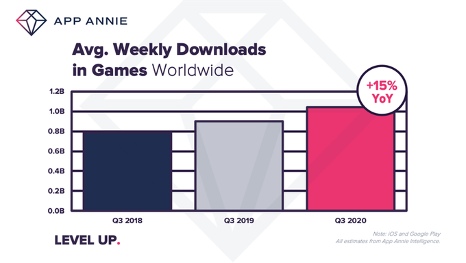 Las descargas de juegos alcanzaron los 14 mil millones en el tercer trimestre, y las descargas aumentaron un 20% año tras año en Google Play a alrededor de 11 mil millones. En iOS, los consumidores descargaron 2.600 millones de juegos. Debido a esto, los juegos representaron una mayor proporción de descargas generales en Google Play (45%) en comparación con iOS (30%).