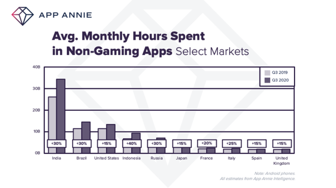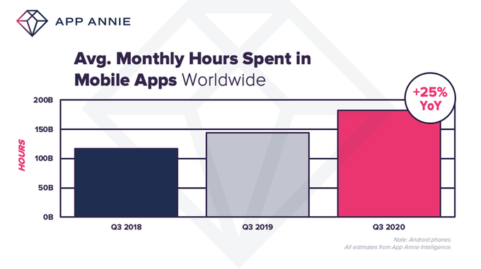 El uso de dispositivos móviles sigue siendo alto en medio de la pandemia de COVID-19, que ha provocado medidas de distanciamiento social y políticas de bloqueo, y ha empujado a los consumidores a conectarse en línea para trabajar, estudiar y socializar. Esto, a su vez, ha ayudado a impulsar un gasto récord en aplicaciones durante el trimestre, así como un gran aumento en el tiempo dedicado a las aplicaciones. Según un nuevo informe de App Annie, los consumidores del tercer trimestre descargaron 33 mil millones de nuevas aplicaciones en todo el mundo y gastaron un récord de $ 28 mil millones en aplicaciones, un 20% más año tras año. También pasaron más de 180 mil millones de horas colectivas cada mes de julio, agosto y septiembre de 2020 usando aplicaciones, un aumento del 25% año tras año.