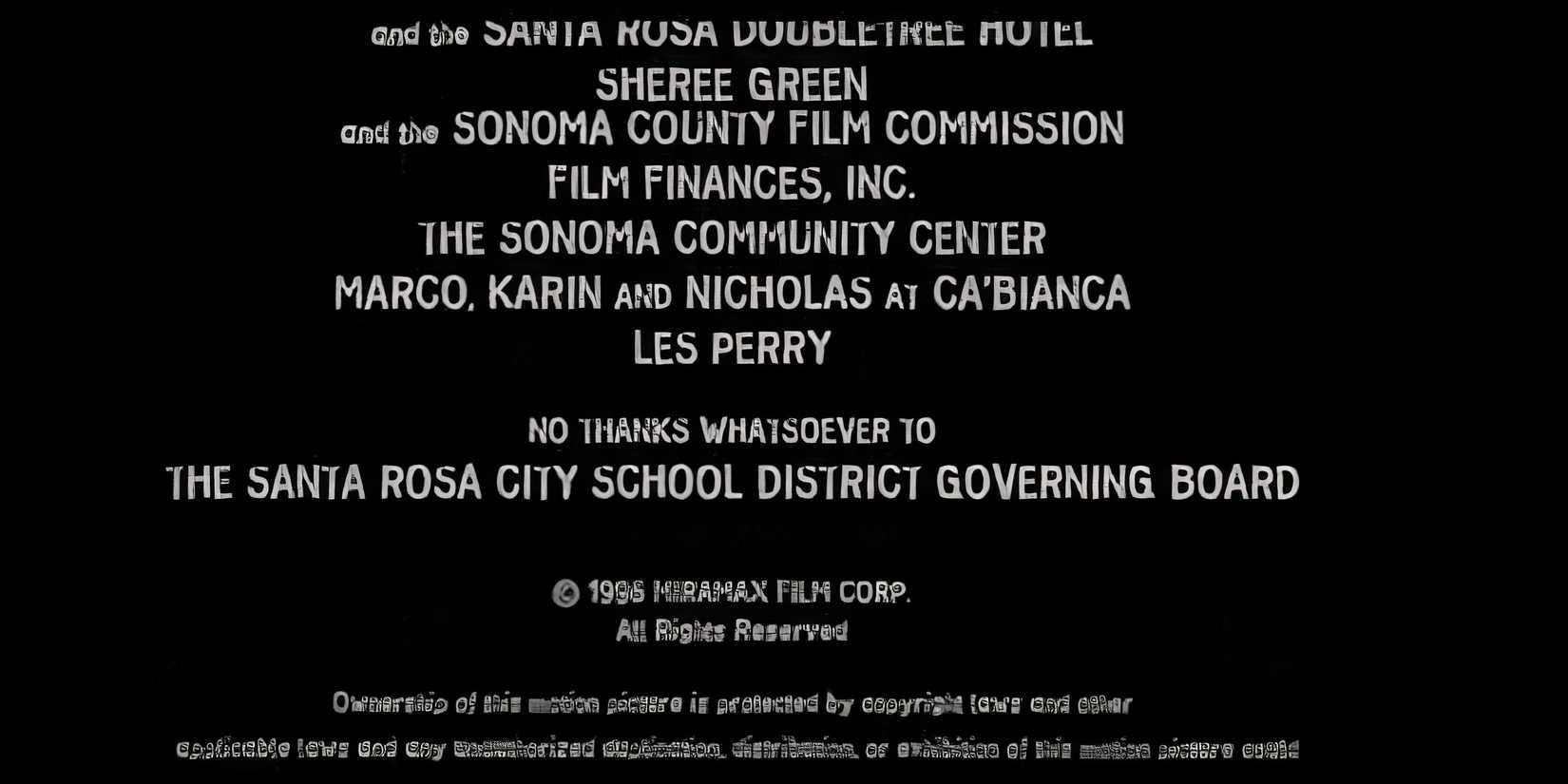 En el fondo de GritarCréditos finales, justo antes de la marca registrada Miramax y “Reservados todos los derechos“El lenguaje de copyright es un mensaje curioso: “No, gracias en absoluto a la Junta Directiva del Distrito Escolar de la Ciudad de Santa Rosa.“. Es extraño verlo en el lugar generalmente reservado para un gesto de agradecimiento a personas u organizaciones que fueron especialmente útiles en la realización de una película, pero Wes Craven claramente tenía otras ideas. Aún más divertido es que llegó al final de una considerable lista de agradecimientos.