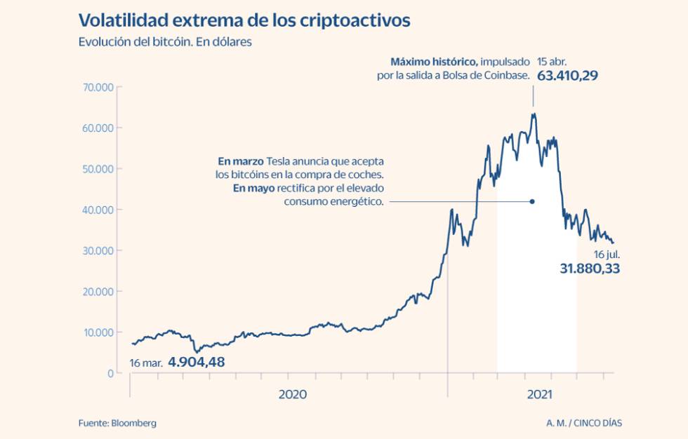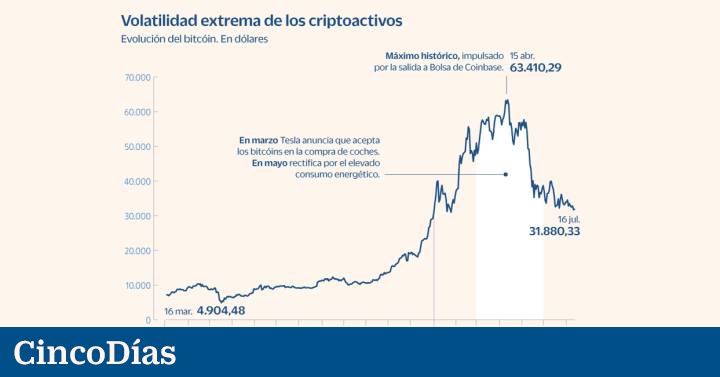 Los activos digitales registraron en el arranque de 2021 un auténtico boom al calor de la espectacular revalorización registrada por el bitcóin. El criptoactivo por excelencia inició el año por debajo de los 30.000 dólares y escaló por encima de los 63.000 arropado por Tesla y su fundador, Elon Musk, así como por su adopción por parte de otras empresas y catapultado por la salida a Bolsa de la plataforma de compraventa de activos digitales Coinbase. Pero hasta ahí. Desde finales de abril el universo de los criptoactivos ha visto cómo desaparecían de un plumazo más de un billón de dólares, penalizado por el endurecimiento del veto de China y problemas de la plataforma Binance en el Reino Unido.