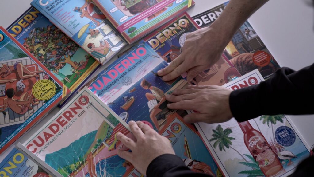 La editorial barcelonesa Blackie Books publica este miércoles la décima edición de su Cuaderno de actividades para adultos, el cuaderno de pasatiempos cuyo proceso creativo refleja el vídeo que acompaña esta noticia. La idea se le ocurrió al editor y fundador de la editorial, Jan Martí, quien encargó el proyecto al ilustrador Cristóbal Fortúnez, al que conoció a través de su blog Fauna Mongola, y a Daniel López Valle, por entonces concursante de Saber y ganar (La 2). “Creador e ilustrador funcionan como coautores. Son dos cabezas pensantes y eso afecta la visualización de los ejercicios”, explica Martí. Este año, la editorial duplica su apuesta con el cuaderno de actividades Golden, una edición para lectores de más edad, con ejercicios basados en personajes como Joan Manuel Serrat, Marisol o Lola Flores.