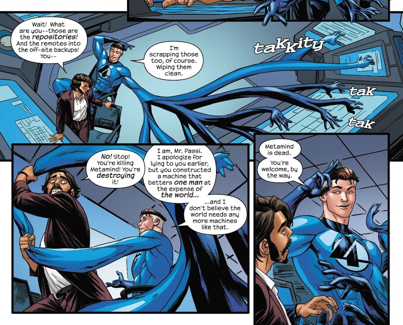 En Cuatro Fantásticos #14, el uso de sus habilidades es mucho más informal, lo que de alguna manera hace que verlo sea más inquietante. Crea una docena de manos nuevas para apagar Metamind tan rápido que parece ser una actividad regular. Con suficiente necesidad, parece posible que Reed pueda estirarse hasta formar un segundo cuerpo completo, o tal vez más. Como mínimo, convertir cada miembro en una docena de otros, de la misma manera que convierte a muchos en un pequeño ejército. Su mente funciona lo suficientemente rápido para varias personas, y su asombrosa habilidad para desarrollar nuevas extremidades que funcionan de forma independiente expande aún más su presencia.