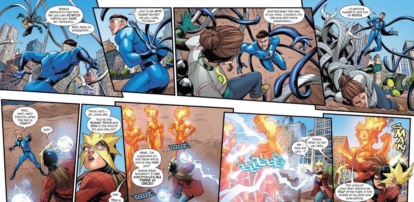 Mr. Fantastic está en una forma poco común, ya que demuestra cuánto puede cambiar y moldear su cuerpo sin sudar. Saca a Lady Octopus con una mano, burlándose de ella diciéndole que puede”brazo [himself]”tan bien como puede, mientras él convierte cada dedo en un apéndice largo con forma de tentáculo.