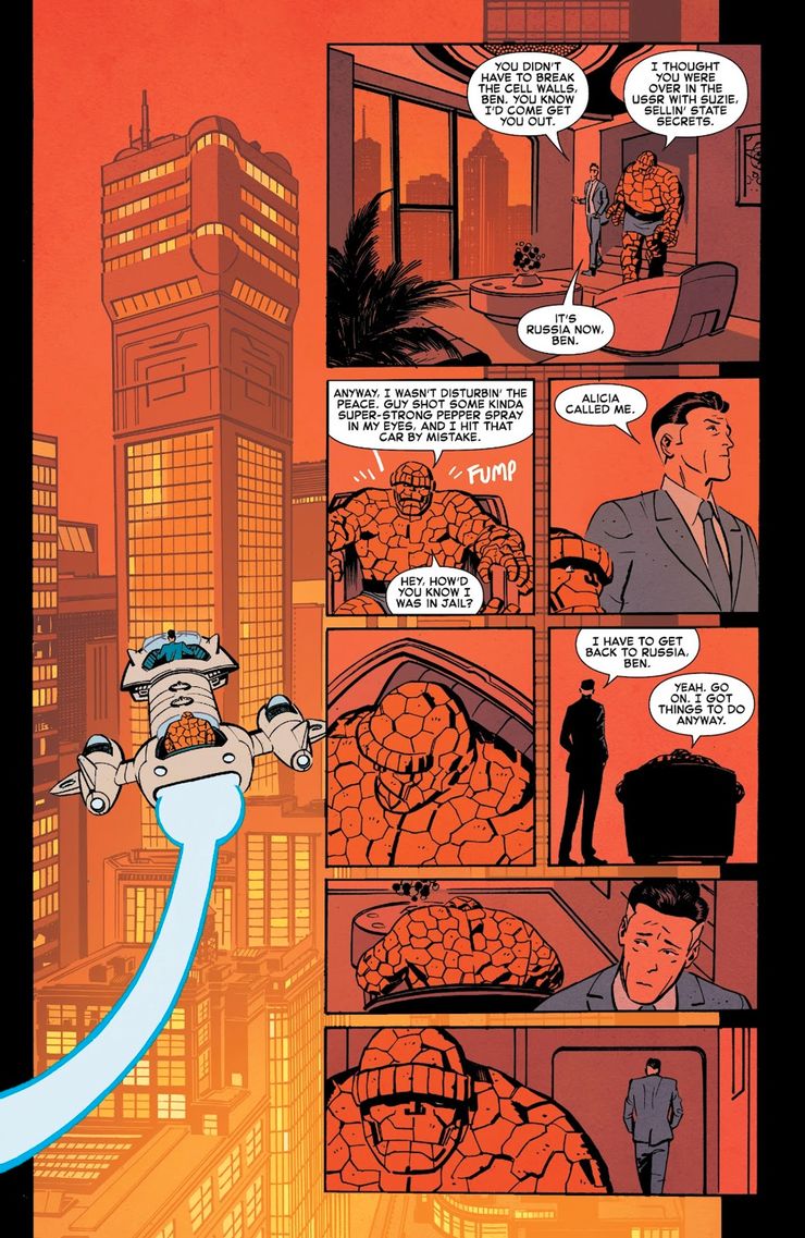 Esto incluso se reconoce en La cosa # 1: Reed Richards saca a Ben Grimm de prisión después de un día increíblemente estresante (después de que Ben vio a su prometida Alicia Masters caminando con otro hombre y asumió que estaba engañando). Ben se sorprende de que Reed viniera a buscarlo, creyendo que tanto él como Susan Storm estaban en la URSS. Reed responde “Es Rusia ahora, Ben”. Ben Grimm, como piloto estadounidense, seguramente recordaría el nombre del país cuando era el enemigo más temido de Estados Unidos. Los tiempos y las situaciones geopolíticas cambian, pero la cosa no. Esto refleja su difícil situación con sus poderes de alguna manera, ya que Ben es el único miembro de los Cuatro Fantásticos que no puede “desconectar” sus poderes.