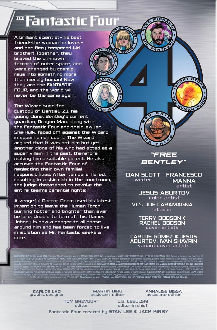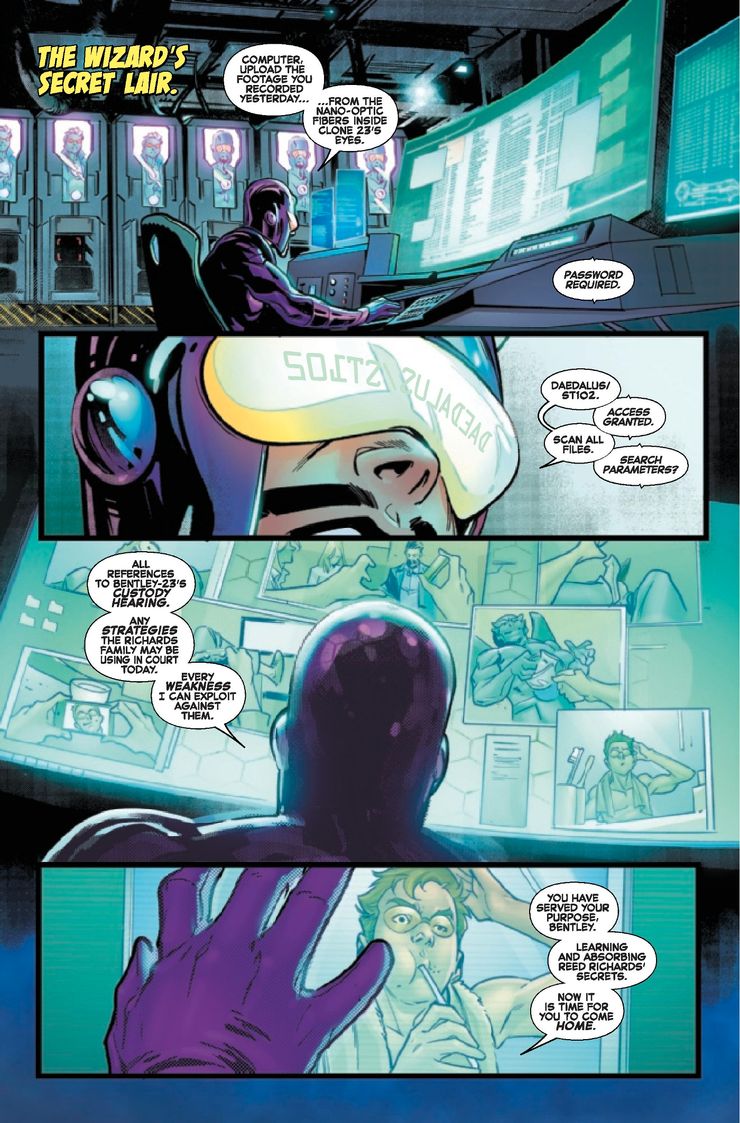 Cuatro Fantásticos responde esa pregunta centrándose en las prioridades de Reed. La Antorcha Humana, Johnny Storm, perdió recientemente el control de sus poderes después de que el Dr. Doom lo bombardeara con rayos cósmicos concentrados (debido a que su prometida lo engañó con Johnny). Ahora, la Antorcha Humana no puede apagar su llama, y se ve obligado a vivir en un traje de contención que apenas puede contener su poder, esencialmente cambiando roles con The Thing como el paria del grupo. En Cuatro Fantásticos #39, el resto del equipo se dirige a los tribunales para una audiencia en la que el mago cuestiona su derecho a ser los tutores legales de sus hijos, y desea recuperar su joven clon Bentley-23. Cuando Johnny confronta a Reed y le recuerda que no ha cumplido su promesa de encontrar una cura para su condición, Reed responde que está demasiado ocupado en este momento: “En este momento, mis hijos me necesitan.” Disfruta de la vista previa, a continuación: