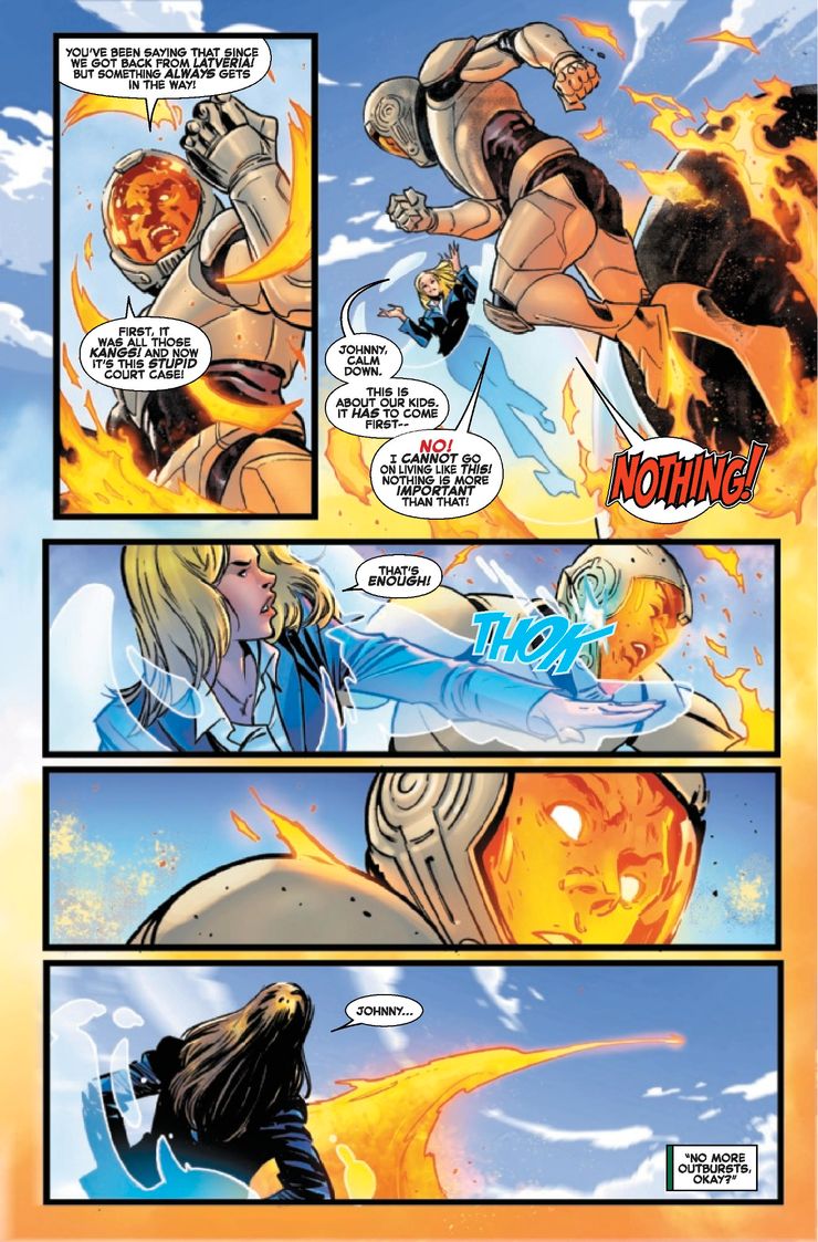 El arrebato de Johnny es comprensible. Señala que siempre hay algo que se interpone en el camino, ya sea una crisis que amenaza al mundo que necesita la atención de Reed o algo más relacionado con su familia. Este es un punto fuerte, uno que lastima a los Cuatro Fantásticos en su esencia misma. Johnny está insinuando que él no es, de hecho, parte de la familia de Reed, o al menos no se le considera así, porque siempre está enfocado en Sue y sus hijos. Sin embargo, lo mismo podría aplicarse a la Cosa. Cuántas veces Ben debe haber mirado a Reed jugando con Franklin o Valeria, y pensó que podría haber usado ese tiempo para encontrar una cura para que él también pudiera vivir una vida normal. Johnny no tiene la paciencia de Ben y grita eso: “¡Nada es más importante que eso!” antes de ser abofeteado por su hermana Sue en un momento humillante.