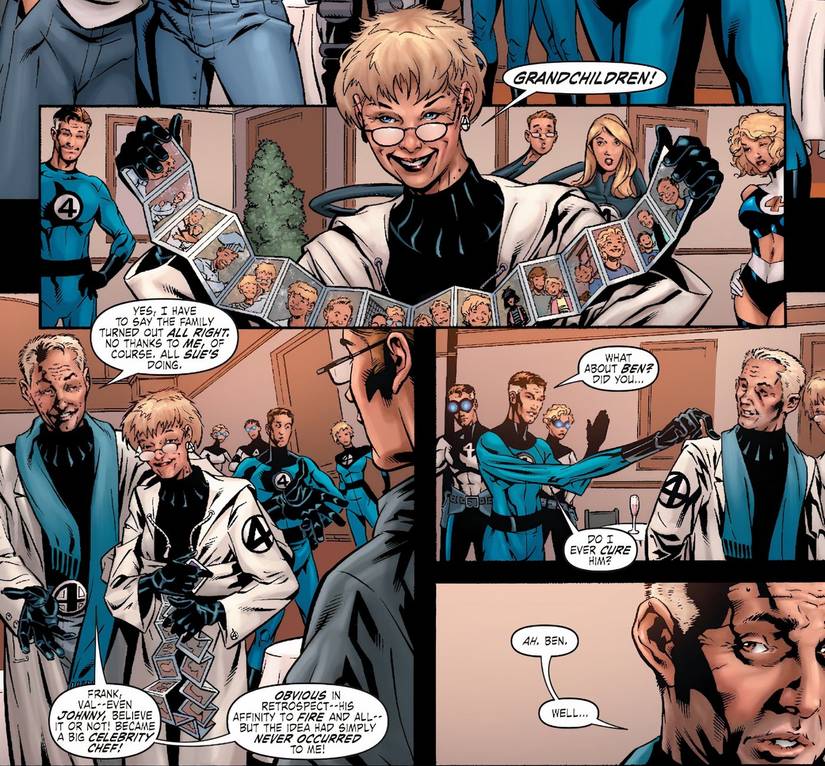 La pareja de cuarenta años en el futuro les asegura a sus yo más jóvenes que todo va a salir bien, llegando incluso a decir: “Frank, Val… ¡incluso Johnny, lo creas o no! ¡Se convirtieron en chefs famosos!“ Las artes culinarias no son lo primero que los fanáticos asocian con la Antorcha Humana, pero esta carrera es realmente perfecta.