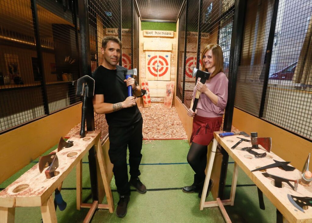 Cuando Jack Nicholson clavó su hacha en la puerta del baño del El resplandor no sabía que, de forma menos agresiva en la vida real, su proceder iba a inspirar uno de los juegos de moda en la capital. De hecho, un cartel que homenajea a la película cuelga de una de las paredes de El Hachazo, la sala en el que se practica el lanzamiento de hachas. José María Nicolás (48) y Montserrat Llanos (51) son la pareja que pone todos los días de la semana a disposición de sus clientes este entretenimiento. Antes de abrir este último local el 9 de julio del año pasado en el número 26 de la calle de Hernani, él era funerario y ella, tesorera. En plena pandemia, se atrevieron a empezar de cero con el objetivo de hacer algo divertido para la gente y abrir esta sede. “Vivimos en una sociedad que va muy deprisa, no paramos y todos pasamos por etapas depres. Jugar aquí sirve para divertirse y para desestresar. El sector del ocio encajaba con nuestra personalidad y ahora no nos cuesta venir a trabajar”, afirma la dueña.