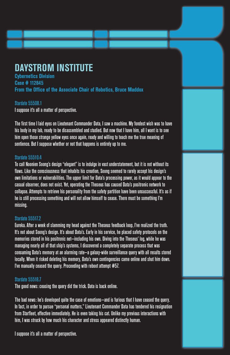 El número no especifica qué hizo esto, pero un texto en el número 18, hecho para parecerse a un memorando de Bruce Maddox, revela que Data estaba ejecutando algún tipo de consulta a través de la computadora de la nave, y todo lo que aprendió hizo que se apagara.