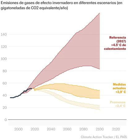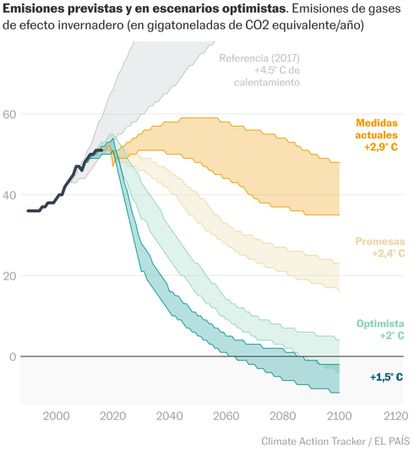 Lo que dice el gráfico es que hemos frenado las emisiones de gases invernadero. Ahora el calentamiento esperado para 2100 no es de cuatro o cinco grados centígrados, sino que se quedaría en tres grados. Si además los países cumplen las promesas que han hecho, las emisiones podrían empezar a descender ya, como muestra la curva de color claro, aunque la temperatura global todavía subiría 2,4 grados.