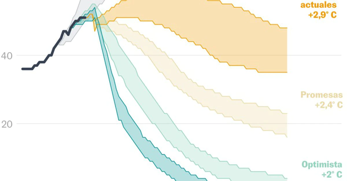 Lo que dice el gráfico es que hemos frenado las emisiones de gases invernadero. Ahora el calentamiento esperado para 2100 no es de cuatro o cinco grados centígrados, sino que se quedaría en tres grados. Si además los países cumplen las promesas que han hecho, las emisiones podrían empezar a descender ya, como muestra la curva de color claro, aunque la temperatura global todavía subiría 2,4 grados.