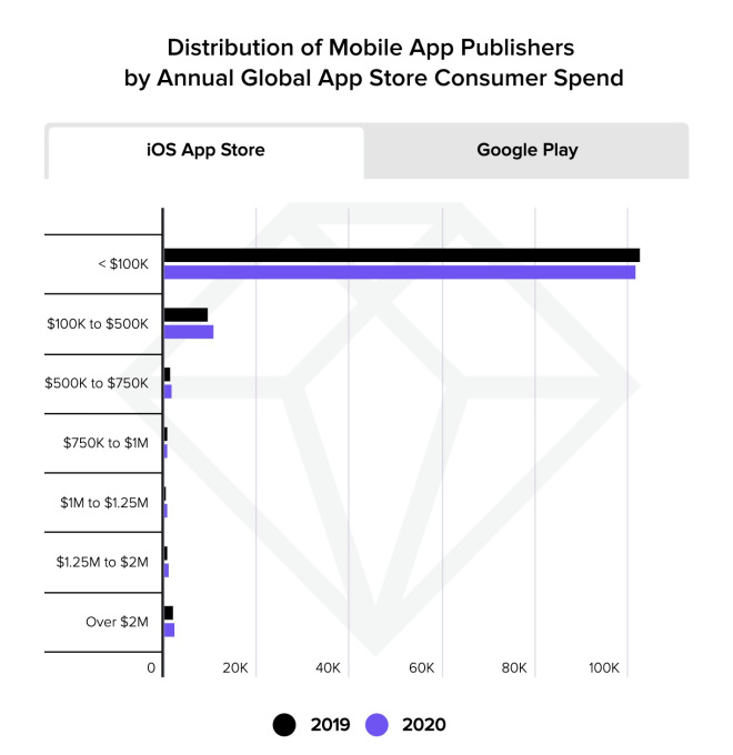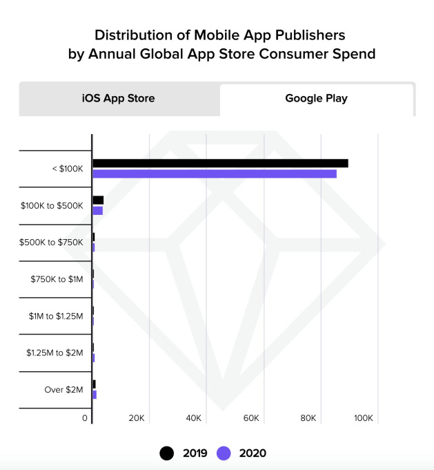 Este patrón de distribución en el que el grupo más grande de desarrolladores está ganando menos de $ 100,000 y una porción del mercado estaba obteniendo cifras más grandes, incluido el grupo de más de $ 2 millones, fue similar a la App Store de Apple en 2020. Pero en el caso de Apple, ve más desarrolladores obteniendo un ingreso decente en los otros grupos de menos de $ 1 millón que Google Play.