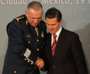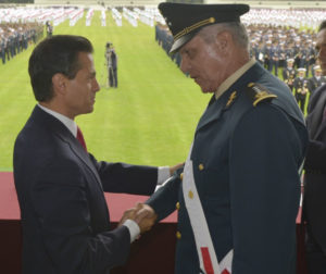 Frente al poder. Con el entonces Presidente Enrique Peña Nieto, Salvador Cienfuegos participa el 20 de noviembre de 2014 la ceremonia de entrega de ascensos y condecoraciones a integrantes de las Fuerzas Armadas. En ese acto, Peña Nieto dijo que lo que los mexicanos demandan es que la ley se cumpla, prevalezca el orden y se avance hacia mayores condiciones de prosperidad.