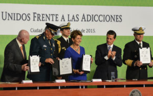 Frente a las adicciones. Durante la Firma de Colaboración entre la Secretaría de la Defensa, Secretaría de Marina y la Secretaria de Salud, para implementar acciones para prevenir las adicciones. Realizada en el Centro de Estudios Superiores Navales el 21 de julio de 2015 y encabezada por el entonces presidente Enrique Peña Nieto.