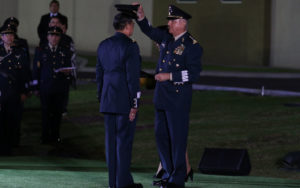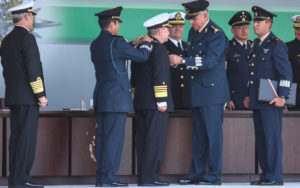 Reconocimiento y colaboración. Condecorando al almirante William E. Gorthey, comandante del Comando Norte de Estados Unidos, en una ceremonia realizada en el patio de la Escuela Naval Militar, el 28 de abril de 2016.