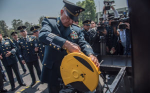 Desarme. En la imagen, Cienfuegos inhabilita un arma de grueso calibre durante la Ceremonia de Destrucción de Armas de Fuego, el 6 de marzo de 2018, cuando se destrozó parte de las mil 800 piezas que el ejército mexicano aseguró al crimen organizado mediante operativos especiales.