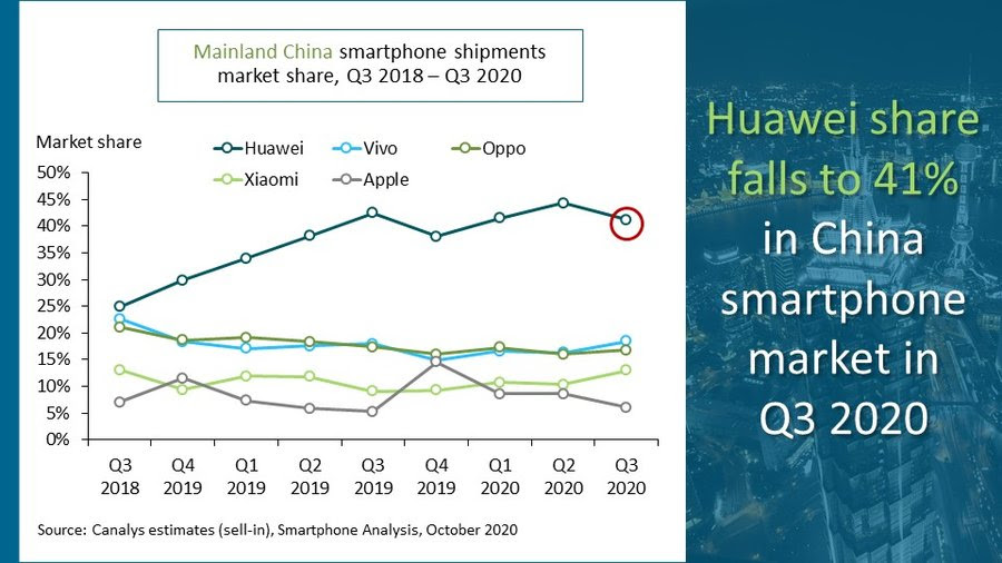 Huawei cayó un 18% en China continental, año tras año. Vivo y Oppo registraron caídas similares en 13 y 18%, respectivamente. Xiaomi pudo recuperar terreno en el tercer lugar, ganando un 19% interanual según las cifras. Mientras tanto, Apple se mantuvo relativamente estable, a pesar del retraso en el lanzamiento del iPhone 12. Las continuas luchas de Huawei podrían proporcionar un vacío para que la competencia lo llene.