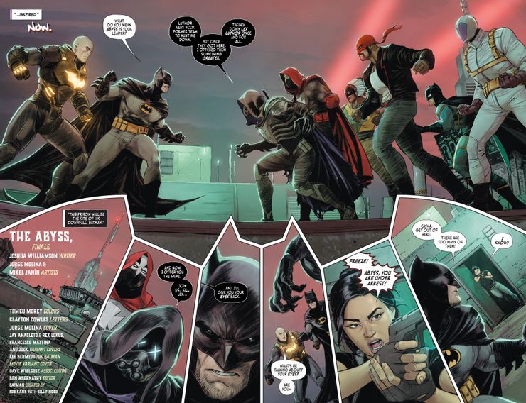 al final de hombre murciélago # 120 por Joshua Williamson, Jorge Molina y Mikel Janin, Bruce y Lex Luthor descubren que Abyss ahora lidera Batman Inc. Abyss quiere que Bruce mate a Lex, lo que va en contra de los ideales de Batman. Por otro lado, Lex Luthor es el archienemigo de uno de los aliados más confiables del Caballero de la Noche: Superman. ¿Se unirá a Lex o pretenderá ponerse del lado de Abyss hasta que vaya demasiado lejos? ¿Qué lado elegirá?