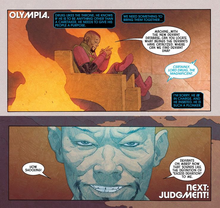 Eternos #12 y el FCBD: Vengadores/X-Men #1 ambos muestran que se podría considerar que los mutantes, que ahora se consideran Desviados, están experimentando una desviación excesiva debido a su inmortalidad. Ahora que Druig es Prime Eternal, controla los procesos de la Gran Máquina y la Cámara de Activación, por lo que si Druig, quizás con la ayuda de la otra X-Enemy Moira MacTaggert actual, pudo matar a los heroicos Eternals, podría reprogramar. ellos para ver la inmortalidad mutante, y su expansión a Marte, como una desviación excesiva. Esto significa que Druig podría ordenar a los Eternos que ataquen a Krakoa, e inmediatamente podrían entrar en una furia ciega e incluso pueden estrellar el gala del fuego infernal en un intento de comenzar el proceso de acabar con los mutantes.