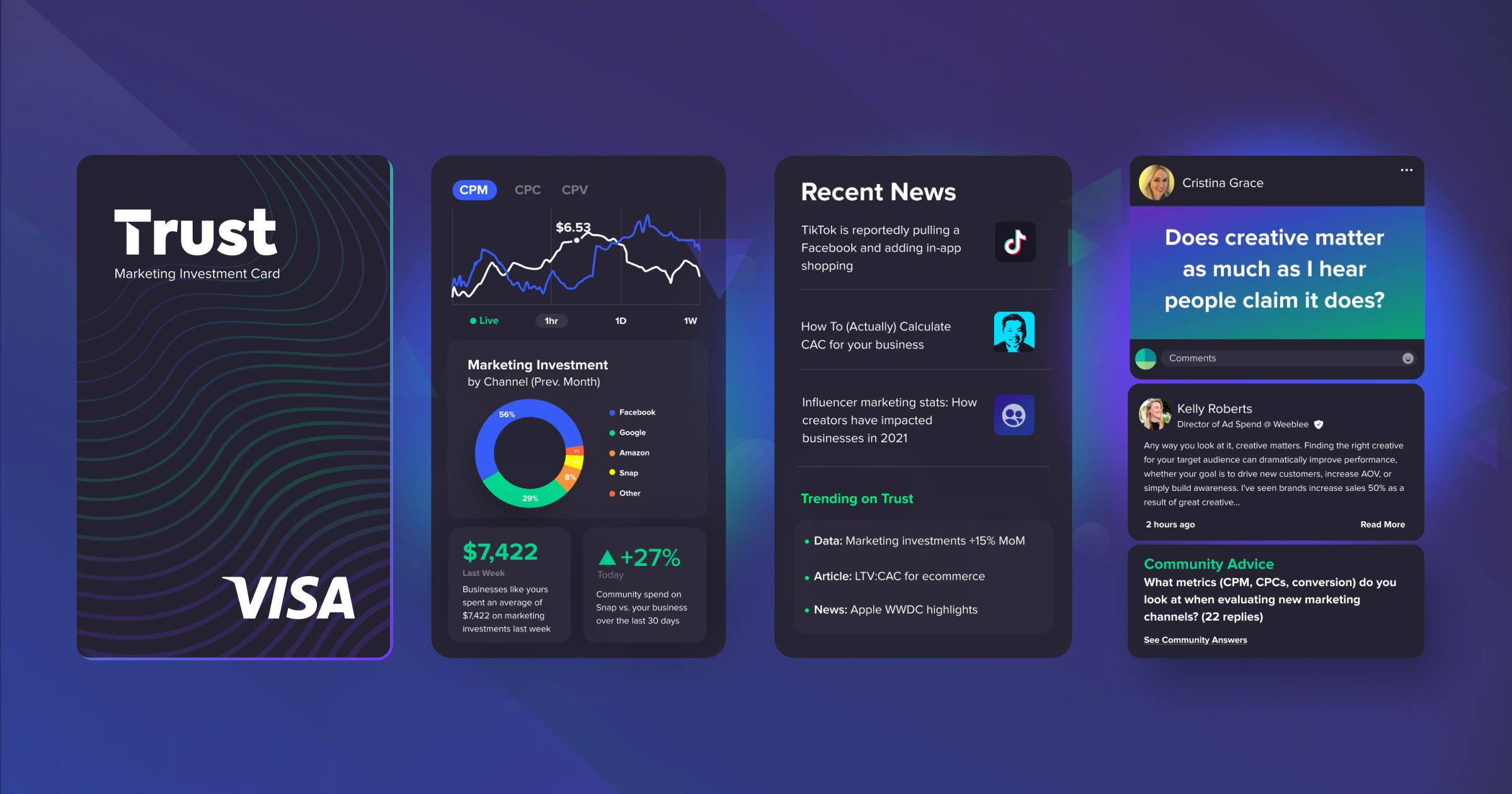 Trust hace esto de varias maneras: su tarjeta, construida en asociación con Stripe, permite a las empresas aumentar su poder adquisitivo hasta 20 veces y tener 45 días para realizar pagos de sus inversiones de marketing, dijo el CEO James Borow a TechCrunch. Luego, como parte de su comunidad, las empresas comparten conocimientos sobre compras de marketing y conocimientos de datos que normalmente se reservan para los grandes anunciantes. Los usuarios incluso reciben noticias a través de su panel de control sobre su estrategia de marketing específica, agregó.