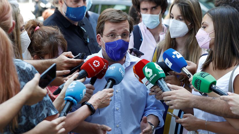 El alcalde de Madrid, José Luis Martínez-Almeida, atiende a la prensa durante su asistencia a uno de los nuevos aparcamientos para motos. En vídeo, declaraciones del día 28 de julio.