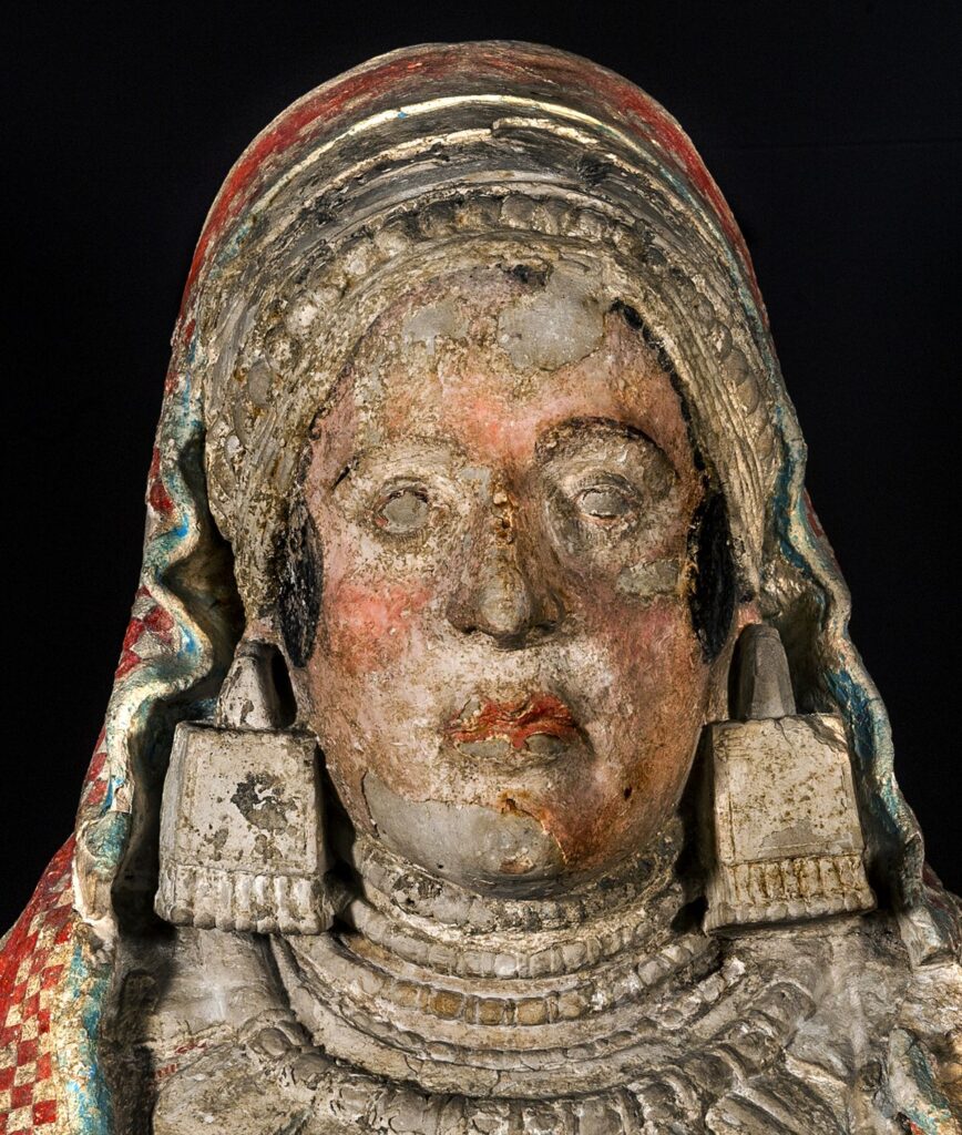 Ahora, el nuevo estudio destaca que “el color se aviva en las mejillas y cobra mayor intensidad en los labios, pintados también de cinabrio. En el tratamiento del rostro, se perfilan en negro las cejas, los bordes de los párpados y las pestañas, estas últimas pintadas sobre finos trazos incisos, realzando así unos ojos pequeños que cobrarían expresividad con la pintura ya perdida del iris y la pupila, y corrigiendo ese aire de mirar sin ver que ahora transmite”.