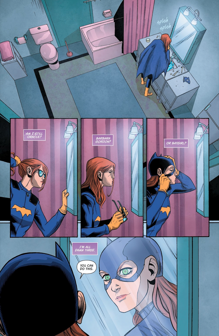 La escena presentada en 2016 Batgirls y las Aves de Presa El número 5, escrito por Shawna y Julia Benson con arte de Roge Antonio, es importante para Gordon. Mientras cuestiona la brújula moral de Birds of Prey, se mete en un baño para contemplar sus propias identidades: la maestra hacker Oracle, la heroica vigilante Batgirl y la civil Barbara Gordon. Mientras declara que ella es “los malditos tres” es un momento rudo para Batgirl, quien ha luchado durante mucho tiempo con la forma en que encaja en el escalón de los héroes, un desafortunado error en el arte ha ocupado un lugar central en la mente de los fanáticos.