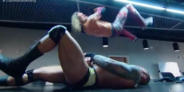 En un momento, Orton fue puesto en una mesa de la sala de conferencias, y Edge vio una oportunidad donde la mayoría no lo haría. Encima de Orton había un tramo de cerca de eslabones, y Edge la agarró y se subió al techo.