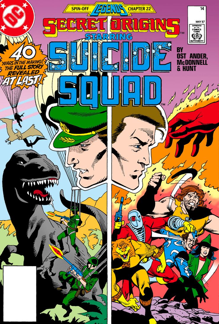 En 1987 Orígenes secretos # 14 escrita por John Ostrander y dibujada a lápiz por Luke McDonell, Ostrander retomó las historias originales de Suicide Squad de Los valientes y los Bravos y Historias de guerra con estrellas de una manera que unía a los viejos grupos a su nuevo concepto: The Dirty Dozen con supervillanos. En el recuento de Ostrander, dividió a Rick Flag en dos personajes, Rick Flag Sr. y Rick Flag Jr, con la bandera mayor encabezando “El Escuadrón Suicida” de Historias de guerra con estrellas, y Rick Flag Jr. liderando el de Los valientes y los Bravos. Rick Flag Sr. recibió la trágica historia de fondo de Los valientes y los Bravos donde fue el único superviviente de una batalla aérea con aviones japoneses. Ostrander también avanzó en la línea de tiempo de Los valientes y los Bravos historias para estar más cerca de los años 80 para que Rick Flag Jr. pudiera ser el líder de su nueva versión de Suicide Squad.