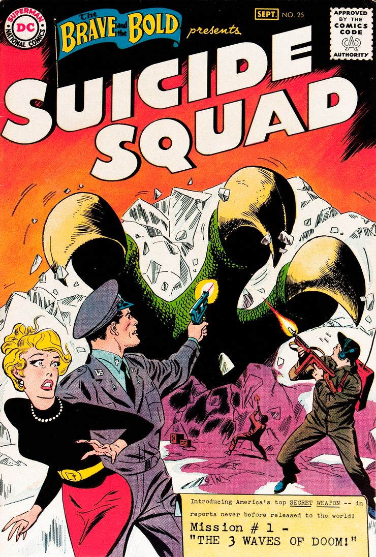 El Suicide Squad original hizo su debut en las páginas de 1959. The Brave and the Bold # 25, con una historia escrita por Metal Men, Sgt. El co-creador de Rock y Barry Allen, Robert Kanigher y dibujado por Ross Andru. El Escuadrón Suicida de Kanigher estaba formado por cuatro miembros, Rick Flag, Jess Bright, el Dr. Hugh Evans y Karin Grace, todos los cuales son los únicos sobrevivientes de grupos anteriores que fueron eliminados en la Segunda Guerra Mundial, que juraron continuar por sus caídos. miembros del equipo. Cada uno de los miembros de este Escuadrón Suicida cree que ha sobrevivido a algo que no debería haber hecho, y es el único equipo dispuesto a asumir riesgos aparentemente fatales mientras lleva a cabo misiones gubernamentales con resultados que acabarán con el mundo en caso de que fracasen. El equipo se presenta como último recurso, abordando misiones solo cuando se han agotado todas las demás opciones. Esta versión del equipo solo aparecería en seis números de Los valientes y los Bravos.