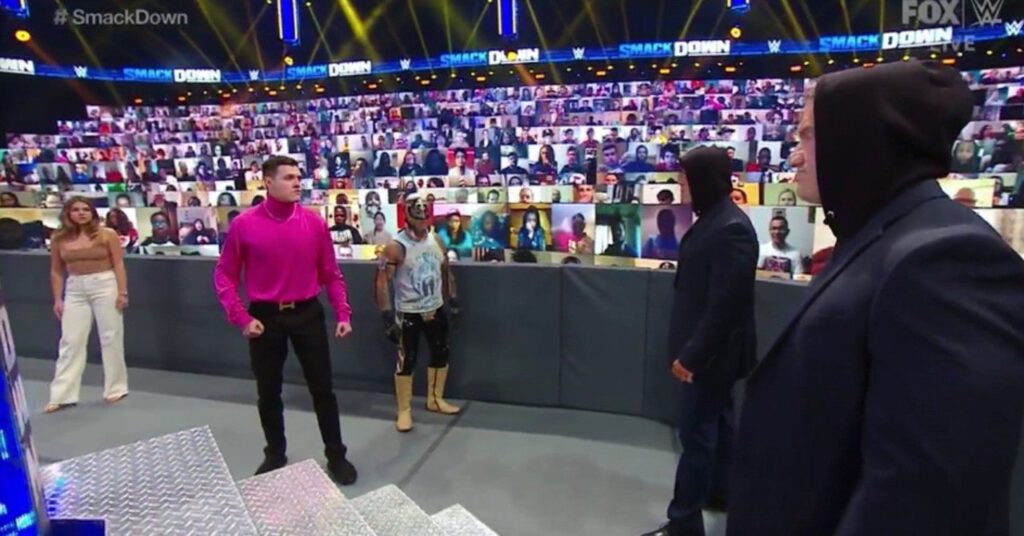 El cuello de tortuga rosa neón de Dominik Mysterio o los matones de Corbin con sudaderas negras y chaquetas de traje. #FashionPolice #SmackDown “
