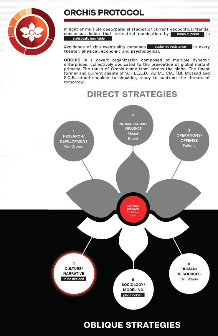 Comenzando en el primer párrafo, las palabras redactadas visibles bajo la luz adecuada se revelan como “homo superior” y “estadísticamente inevitable”, confirmando que los cálculos de Orchis son todavía informando que la ascensión completa de la raza mutante es inevitable, a pesar de que han creado a Nimrod. La siguiente revelación es que en la línea, “Evitar esta eventualidad exige _______”, siendo la palabra redactada “resistencia sostenida”. Por último, el nombre de quien está a cargo de Orchis’”Cultura/Narrativa” ala sigue siendo “por decidir” y quienquiera que tenga el control de sus “Sociología/Modelado” ala es un “titular de lugar” para su colocación permanente. Nuevamente, ninguna de estas palabras reveladas revela verdades impactantes, o cosas que los lectores no podrían haber adivinado, pero ¿significa esto que X-Office ha hecho esto con otras páginas de datos?