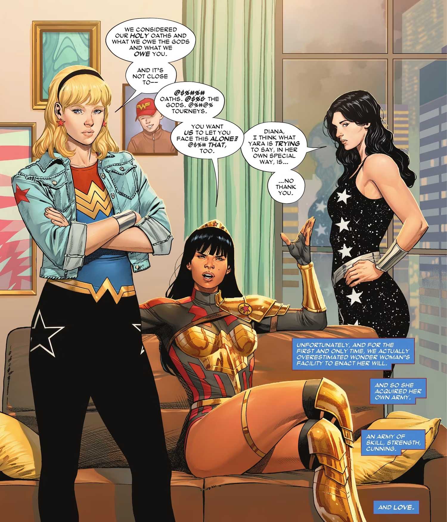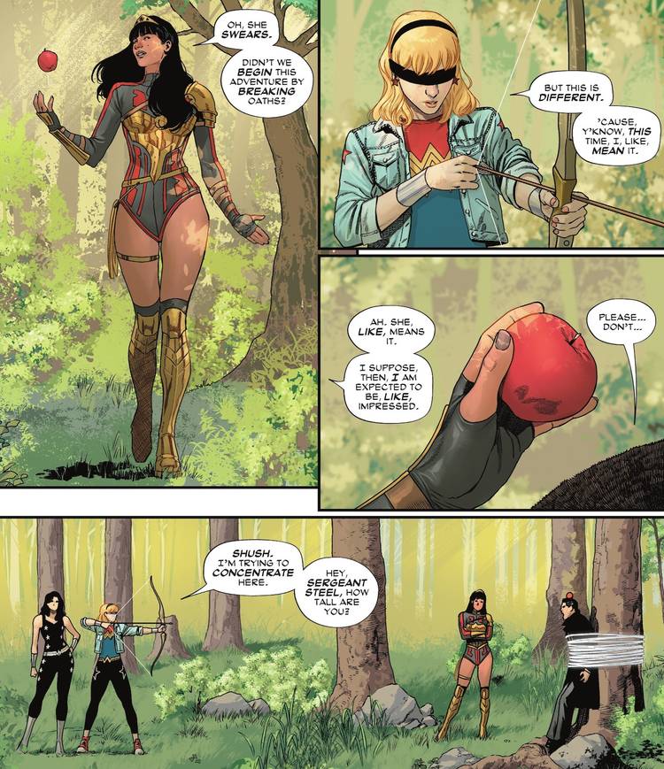 En el recientemente publicado Mujer Maravilla #9, las Wonder Girls han secuestrado al Sargento Steel, el militar que dirigió la campaña del Soberano contra Diana. Se revela que ser capturada ha sido parte del plan de Wonder Woman para acercarse a su enemigo. pero queda por ver cuál es el trabajo de Cassie, Donna y Yara con Steel.. En los meses en que Diana sobrevive al confinamiento solitario mientras el Soberano intenta quebrar su espíritu, las chicas le están dando a Steel algo de venganza: se muestra en el número anterior tratando de dispararle una manzana de la cabeza con los ojos vendados, y de alguna manera falla “accidentalmente”..