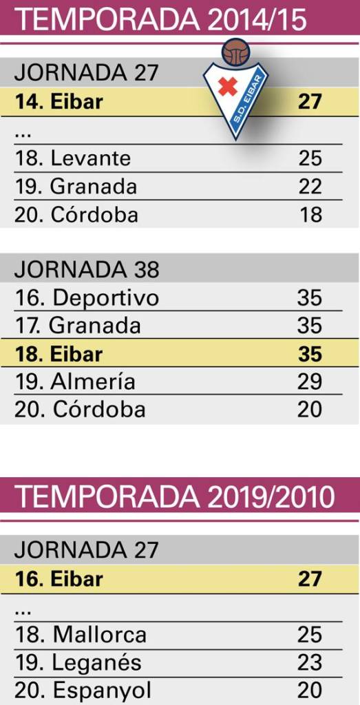 Jornada 27. El Eibar suma 27 puntos, tiene dos de margen sobre los puestos de descenso y las sensaciones empiezan a ser preocupantes. Este diagnóstico que describe la situación actual del equipo armero coincide punto por punto con el que vivió en la temporada de su debut en Primera División hace cinco años. Por aquel entonces, con Gaizka Garitano al frente de la nave, el Eibar se precipitó hacia el abismo en una recta final en la que nada salió como se esperaba y acabó en uno de los tres puestos con billete directo para descender. Su futuro estaba otra vez en Segunda por los méritos deportivos que desplegó, pero terminó salvando la categoría por el castigo administrativo al Elche, que acabó bajando en su lugar.