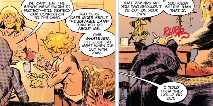 No es raro que un superhéroe tenga una debilidad muy específica, como la aversión de Superman a la kriptonita verde o el miedo al fuego del cazador marciano, pero comer carne es uno de los más extraños. Pero si bien un bistec puede parecer una forma extraña de debilitar a Ka-Zar y Shanna ahora que literalmente pueden imbuirse de la fuerza de los dinosaurios mientras desarrollan nueva biotecnología a través de pura fuerza de voluntad, tiene sentido: sus poderes provienen de su vínculo con la Tierra Salvaje, no solo el control general sobre el mundo natural. Si matan y comen a las criaturas que dependen de ellos, entonces tiene sentido que esto afecte su capacidad para llamarlos más tarde.