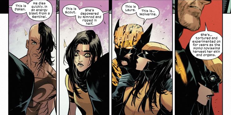 Mientras está en la misión, Wolverine les explica a Daken, Scout y Laura que cada uno de ellos está destinado a sufrir destinos horribles, con los que el mismo Wolverine está muy familiarizado. Daken es asesinado por una explosión de Sentinel, Scout muere después de que la parten por la mitad y Laura tiene el peor destino de todos, ya que es torturada y experimentada durante un período prolongado de tiempo antes de que su cuerpo finalmente se rinda. Cada una de estas muertes recuerda algunas de las pocas veces que Wolverine ha llegado a su fin. Así como Daken fue asesinado por una explosión de Sentinel, Wolverine murió de la misma manera en el futuro distópico de Días del futuro pasado. Scout fue partida por la mitad, al igual que su padre después de que luchó contra Hulk en Marvel’s Ultimate Universe. En cuanto a la muerte tortuosa de Laura, Wolverine pasó por algo igual de insoportable mientras formaba parte involuntariamente del Programa Arma X.