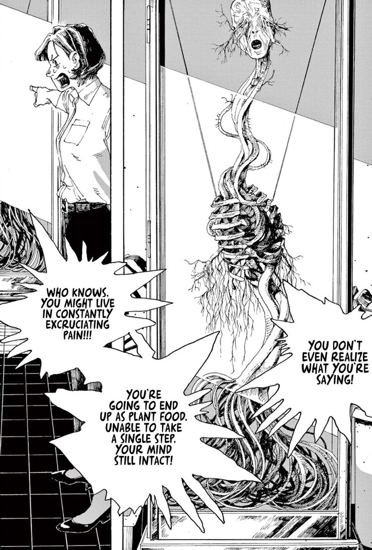 noche tonta introduce el aspecto de terror del manga de inmediato, por lo que aquellos que anhelan el tipo de historia en la que un poderoso medio espiritual ayuda a otros a conectarse con el más allá o exorciza espíritus maliciosos tendrán que esperar. El entorno es bastante deprimente. No hay suficiente aire limpio porque las nubes oscuras cubren perpetuamente el sol, causando que las plantas productoras de oxígeno se marchiten y mueran. Y hay cadáveres extraños que emiten sonidos extraños esparcidos por todas partes. Las plantas crecen de cada grieta imaginable de estos cuerpos destrozados, a veces dejando al descubierto ciertos órganos de manera inquietante. Eso es porque estas pobres almas ya estaban muriendo de alguna otra enfermedad o aflicción y decidieron participar en un procedimiento médico experimental sancionado por el gobierno llamado “transfloración” que los convierte en una planta o árbol llamado flor espiritual. La transfloración les prolonga la vida al menos dos años antes de que se complete el proceso y reciben una gran cantidad de dinero del gobierno ya que, como planta, producen oxígeno que la humanidad necesita desesperadamente.