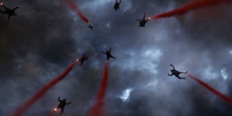 La progresión de la lucha de American Kaiju contra los dragones simbiontes reflejó dos momentos clave de los medios de Godzilla y King Kong. El primero es una referencia al 2014 Godzilla película, dirigida por Gareth Edwards. Hacia el acto final de la película, un equipo liderado por Ford (Aaron Taylor-Johnson) se lanza en paracaídas a San Francisco para recuperar una ojiva nuclear que había sido tomada por un grupo de MUTOs (Massive Unidentified Terrestrial Organism). Esta escena de salto HALO es una de las partes más fascinantes de la película, ya que la cámara sigue desde la perspectiva de los paracaidistas mientras caen en caída libre junto al propio Godzilla.