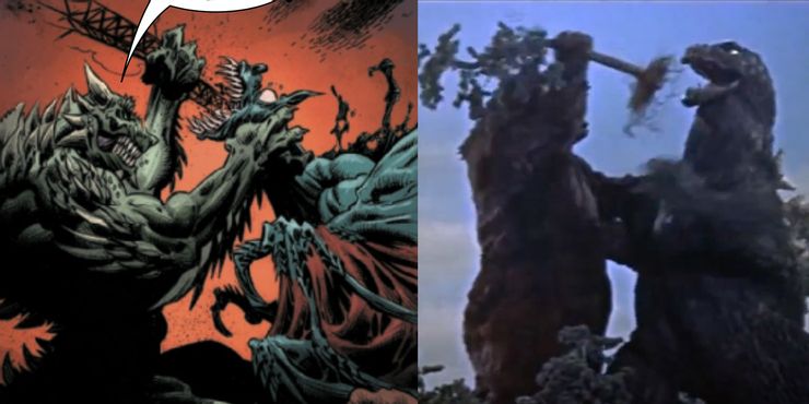 Otra referencia a Godzilla proviene de una escena ahora frecuentemente parodiada de King Kong contra Godzilla (1962). Dirigido por Ishiro Honda, Kong y Godzilla estaban en medio de una pelea cuando el gorila gigante agarró un árbol y lo empujó por la garganta de Godzilla como un trozo de brócoli. Godzilla luego encendió el árbol en llamas con su aliento y le disparó a Kong. En Planeta de los simbiontes # 2, la pelea no tiene un final tan benigno. Enfrentarse a un dragón simbionte de dos cabezas (quizás en referencia a 1964 Ghidorah, el monstruo de tres cabezas), American Kaiju tomó una aguja de un parque de diversiones y apuñaló al dragón en la garganta con ella, matando a su enemigo.