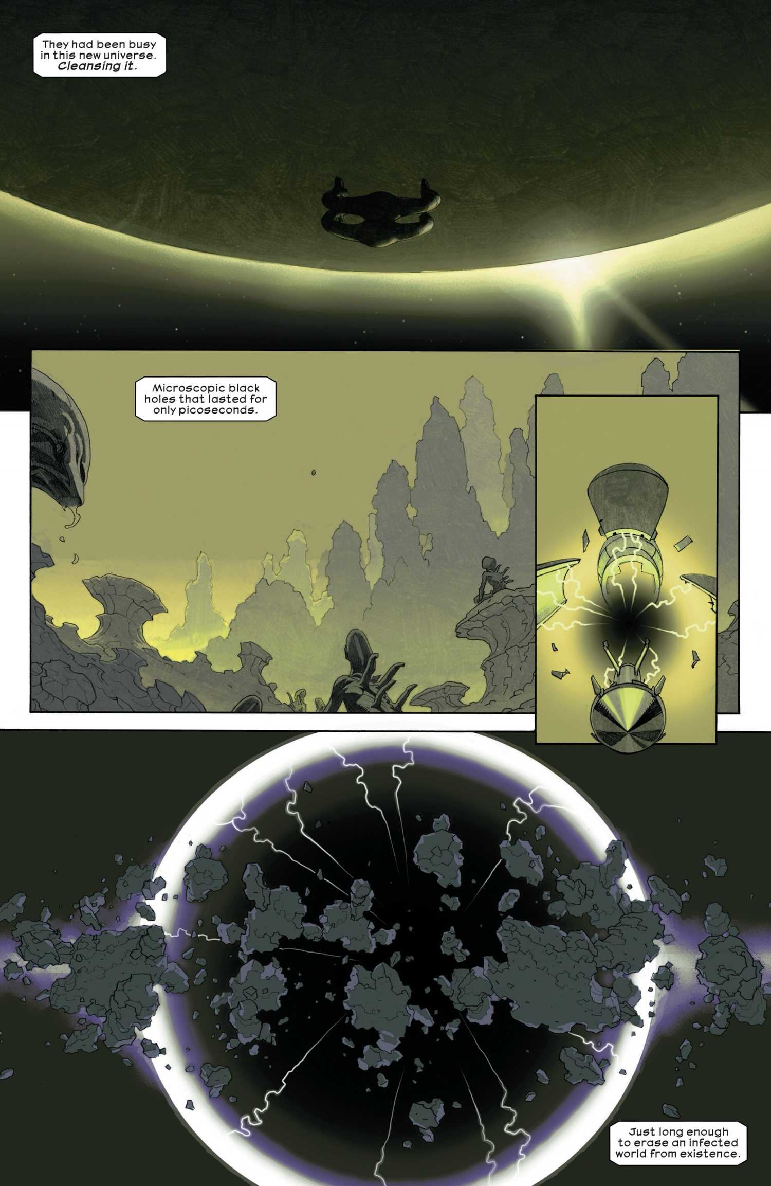 Mientras que T’Challa y sus fuerzas comenzaron a luchar contra los Xenomorfos junto con el hijo adulto de Black Panther, Azuri, finalmente fueron interrumpidos por un tercero: los ingenieros. Despliegue un agujero negro microscópico que limpió uno de los últimos planetas de xenomorfos restantes del imperio al destruirlo en su totalidad, los ingenieros revelaron que cuando buscan deshacerse de un mundo de su creación más oscura, lo hacen por cualquier medio necesario (no importa cuán brutalmente).