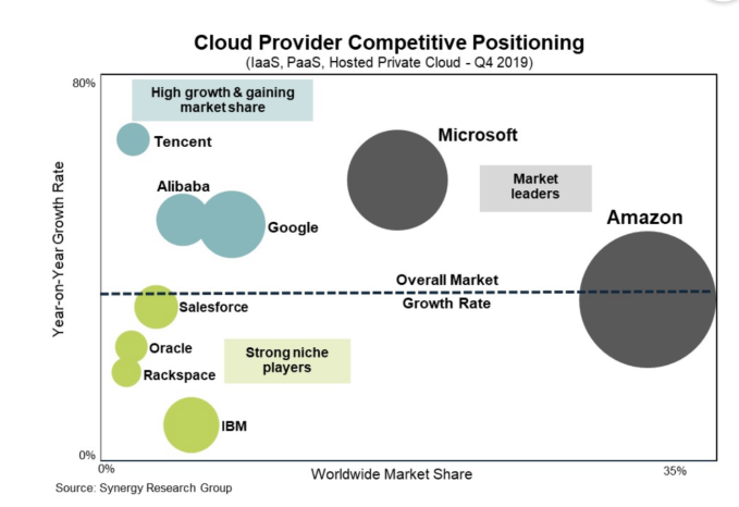 Al igual que con Google, Alibaba se encuentra bastante atrás, como lo muestran los últimos datos de participación de mercado de Synergy Research. El gráfico se generó antes del informe de ayer, pero sigue siendo una ilustración precisa de las posiciones relativas de las diversas compañías.