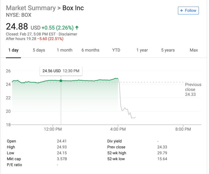 Según la mayoría de las mediciones de sentido común, Box tuvo un informe de ganancias bastante bueno en la actualidad, reportando que los ingresos aumentaron un 20 por ciento anual a $ 163.7 millones. Eso no suena mal, sin embargo, Wall Street no estaba contento con el golpe de las acciones, más del 22 por ciento después de las horas cuando fuimos a la prensa. Parece que los inversores no estaban contentos con la orientación de la empresa.