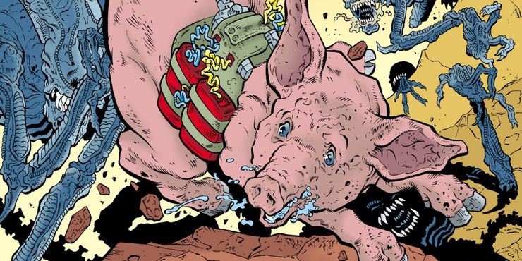 El cerdo se deja caer cerca del asentamiento minero, uno que ha sido invadido por Xenomorfos, y cuando el animal ve a las criaturas alienígenas a su alrededor, el cerdo corre para salvar su vida. Mientras corre por el asentamiento, el cerdo alerta a todos los Xenomorfos de la colmena y, precisamente por su necesidad de matar o capturar a cualquier criatura viviente para garantizar su existencia continua. todo de los extraterrestres persiguen al cerdo. Sin embargo, ese instinto lleva a los Xenomorfos a la aniquilación, ya que no saben qué tipo de daño puede causar el cerdo aparentemente insignificante cuando la bomba finalmente explota.