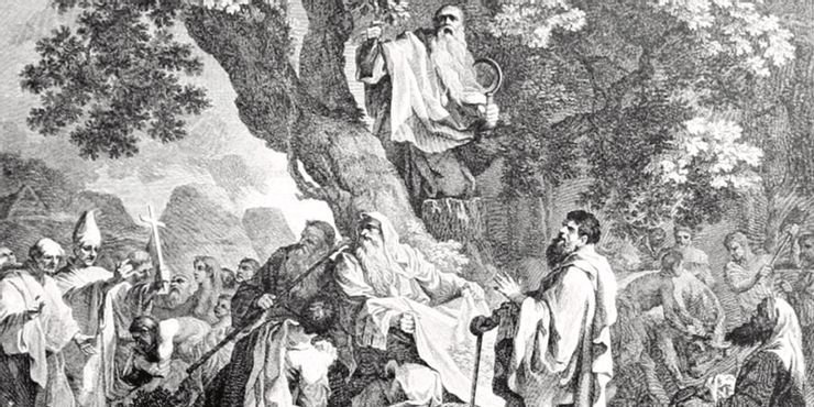 Los “druidas” fueron mencionados por primera vez en el registro histórico por Julio César en su libro Comentarios sobre la guerra de las Galias, “un relato autobiográfico de los años que pasó liderando legiones romanas en la batalla contra la gente de Galia (y Gran Bretaña, brevemente). Según César, los druidas eran sacerdotes, jueces para casos criminales / disputas civiles, estudiaban los movimientos de las estrellas, y oficiantes para rituales y sacrificios religiosos.