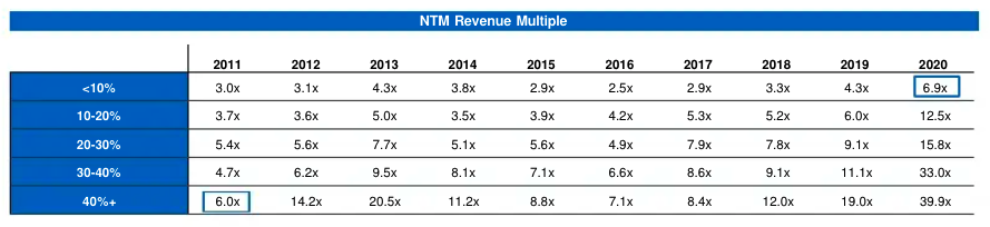 En 2011, las empresas de SaaS que crecían al 40% o más cotizaban a 6,0 veces sus ingresos de los próximos 12 meses. Cambio climático, pero para valoraciones de software.